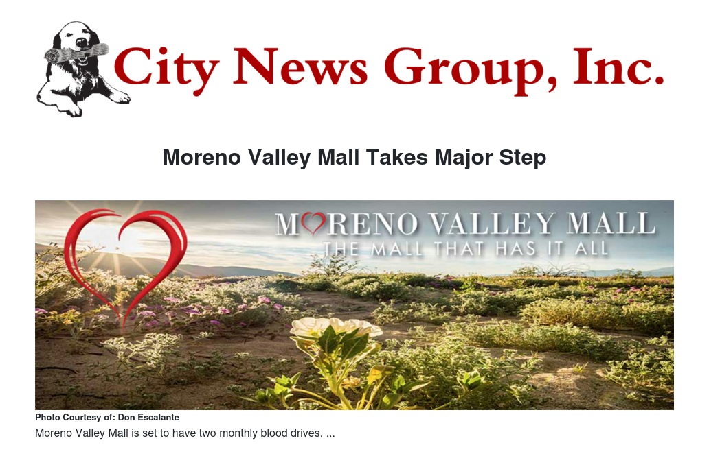 “We look forward to partnering with LifeStream to make this important endeavor a reality,” said Tracie Plefka, the mall’s general manager. “Being able to open our doors to the community in this manner solidifies our desire to remain an integral part of the Moreno Valley community and its continued growth.”