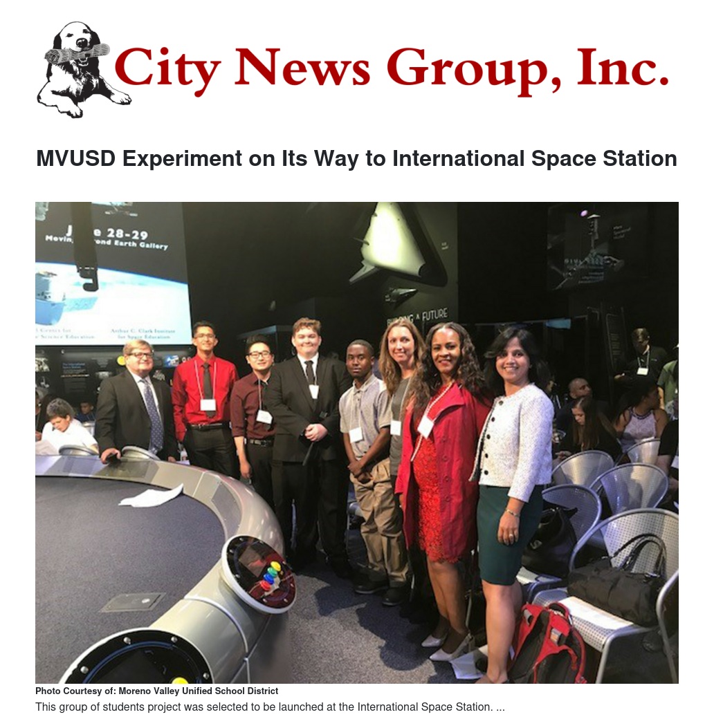 “Participating in this program is providing students real-world experiences that create unique learning opportunities,” said Superintendent Dr. Martinrex Kedziora, “It is so exciting that Moreno Valley Unified School District is now part of the American space program.”