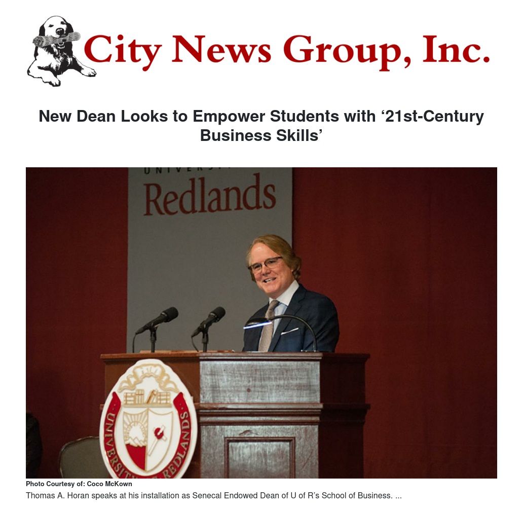 A ceremony celebrated the installation of Thomas A. Horan as Senecal Endowed Dean of the University of Redlands School of Business. Below are excerpts from his remarks, reflecting on his vision and strategy for enhancing the school’s ability to make a difference.