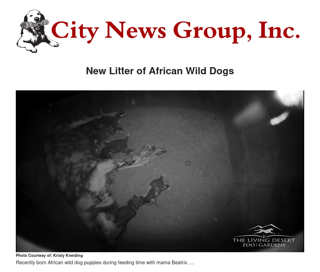 The Living Desert Zoo and Gardens is excited to announce the healthy birth of six endangered African wild dog puppies to first time parents, Beatrix and Kiraka (ker-ah-kuh). In the comfort of a private, underground birthing den, the puppies were born in the afternoon and evening of Wednesday, April 24, 2019. “We are absolutely thrilled to share the news of these African wild dog puppies,” said Allen Monroe, President and CEO of The Living Desert Zoo and Gardens. “So far, Beatrix is doing a great job as a first-time mom.” African wild dogs, also known as painted dogs, have a very complex pack and social structure, and it is recommended by the Species Survival Plan (SSP) to maintain a hands-off approach, which allows the critical bonding and development to happen as naturally as possible. Since the birth, the animal care and veterinary teams have maintained the recommended distance, but have been closely monitoring the family’s activity through den cameras, which allow Beatrix and the puppies plenty of space, comfort, and security.