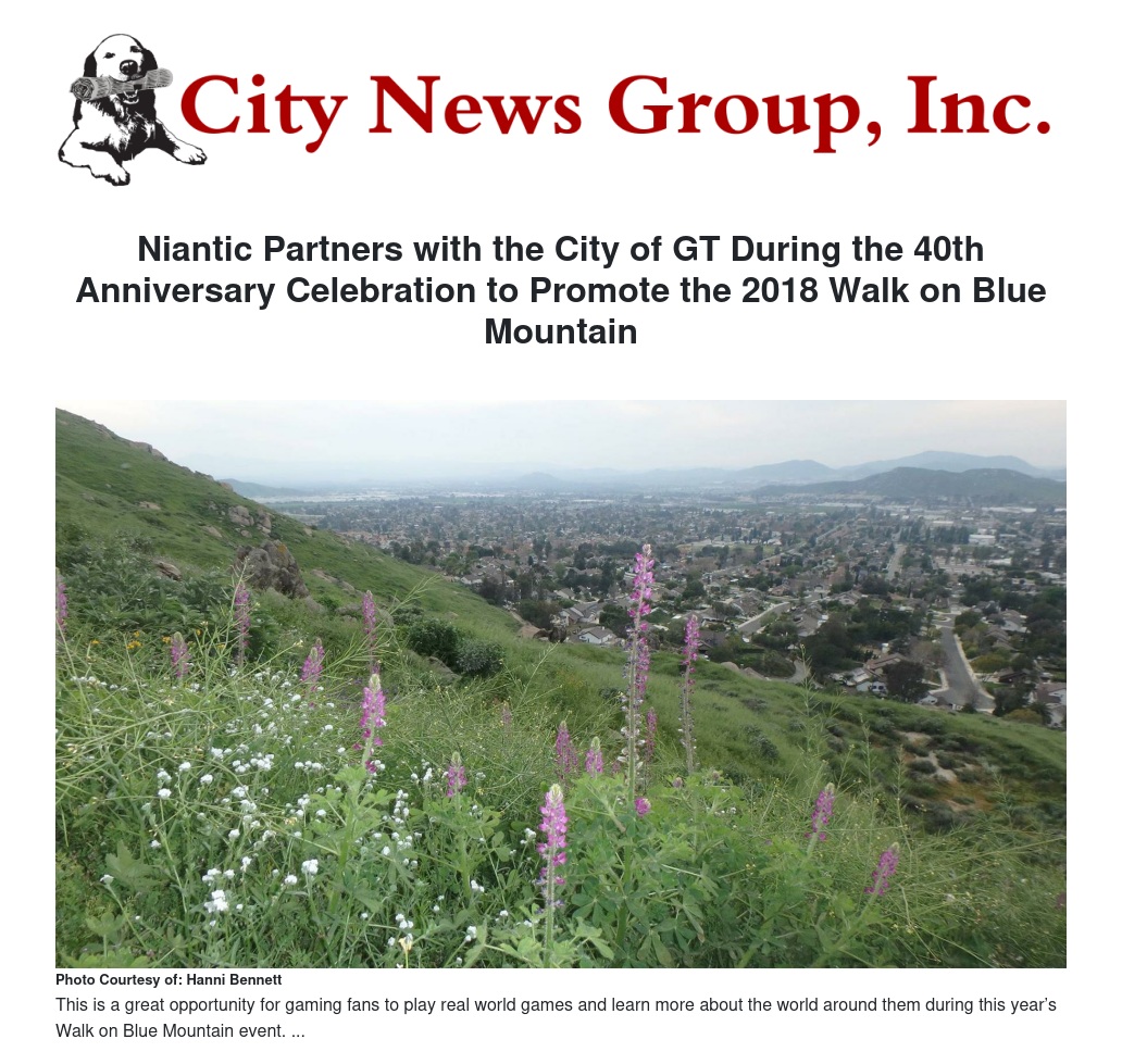 On Saturday, March 3, 2018, from 8 a.m. - 2 p.m., beginning at the corner of Palm Avenue and Honey Hill Drive, the City of Grand Terrace, Friends of Blue Mountain and the Sierra Club, will host the 11th Annual Walk on Blue Mountain event. This year’s event coincides with the City’s 40th anniversary, and to elevate the excitement surrounding this popular event, the City will be partnering with Niantic, Inc., creators of the immensely popular, real world augmented reality (AR) games Ingress and Pokémon GO.