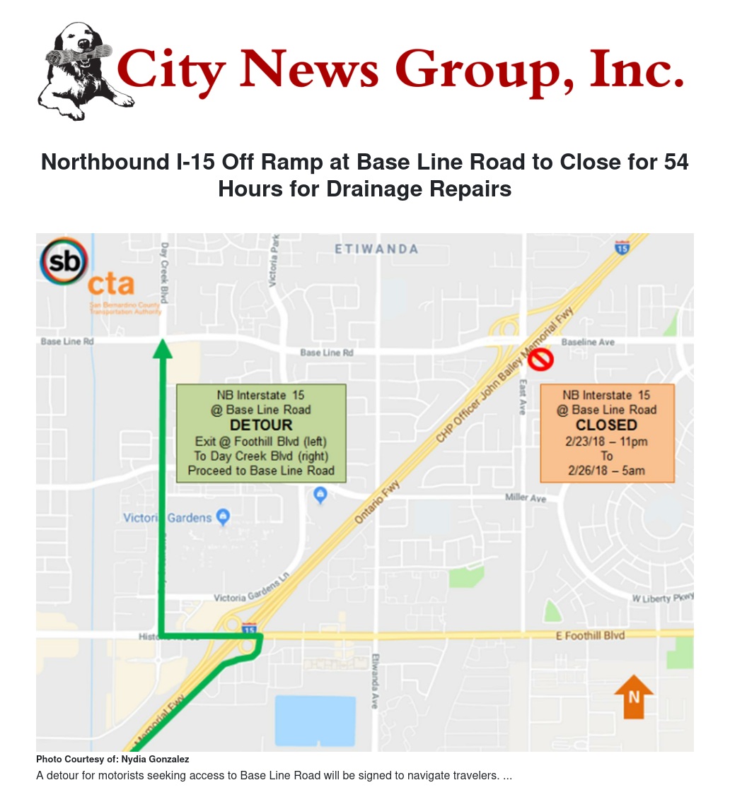 A detour for motorists seeking access to Base Line Road will be signed to navigate travelers from Foothill Boulevard (located one exit to the south) to Base Line Road in Rancho Cucamonga. Base Line Road itself will not be impacted during the weekend operation. Motorists traveling in the area should expect minor delays and plan accordingly.