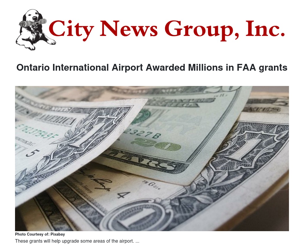 Ontario International Airport (ONT) will receive federal grants totaling more than $11.8 million for important infrastructure repairs, airport officials have been informed.