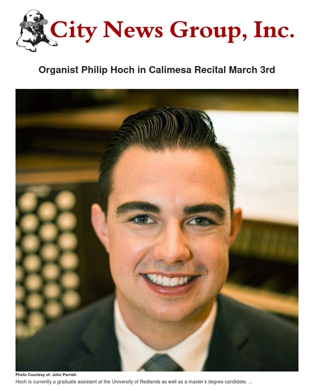 Hoch is currently a graduate assistant at the University of Redlands as well as a master’s degree candidate. His Master of Music organ performance recital was at the school’s Memorial Chapel on Jan. 30, and he has also recently performed by invitation for serious musical audiences around the Inland Empire and Coachella Valley. He plans to continue his music education to the doctoral level, he says.