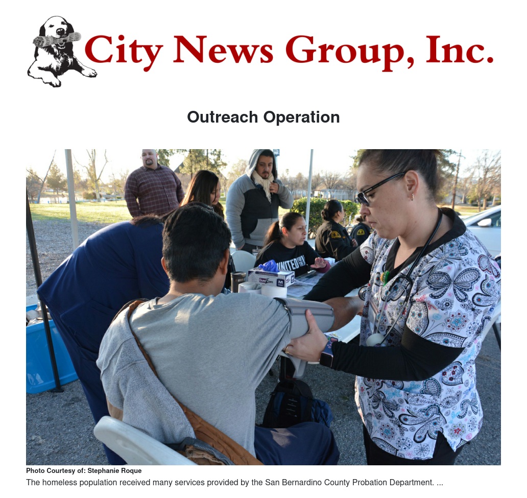 The San Bernardino County Probation Department organized a large-scale, multi-agency outreach to provide resources to the homeless probationers living in the city. More than 130 people were contacted during the outreach. The goal of the event was to minimize risk to homeless probationers and connect those in need with extended support services.