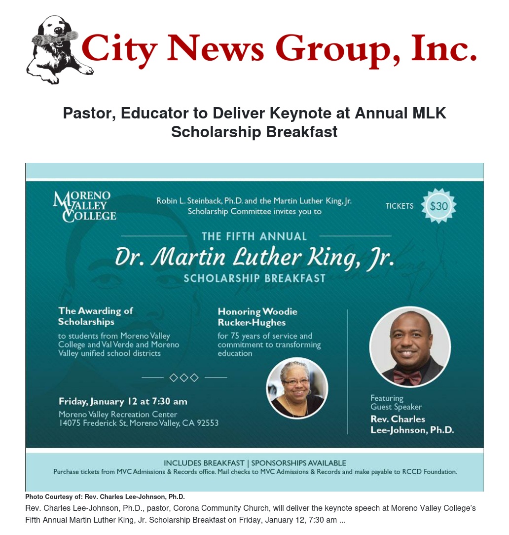 Rev. Charles Lee-Johnson, Ph.D., pastor, Corona Community Church, will deliver the keynote speech at Moreno Valley College’s Fifth Annual Martin Luther King, Jr. Scholarship Breakfast on Friday, January 12, 7:30 am. The College will also be honoring Woodie Rucker-Hughes.