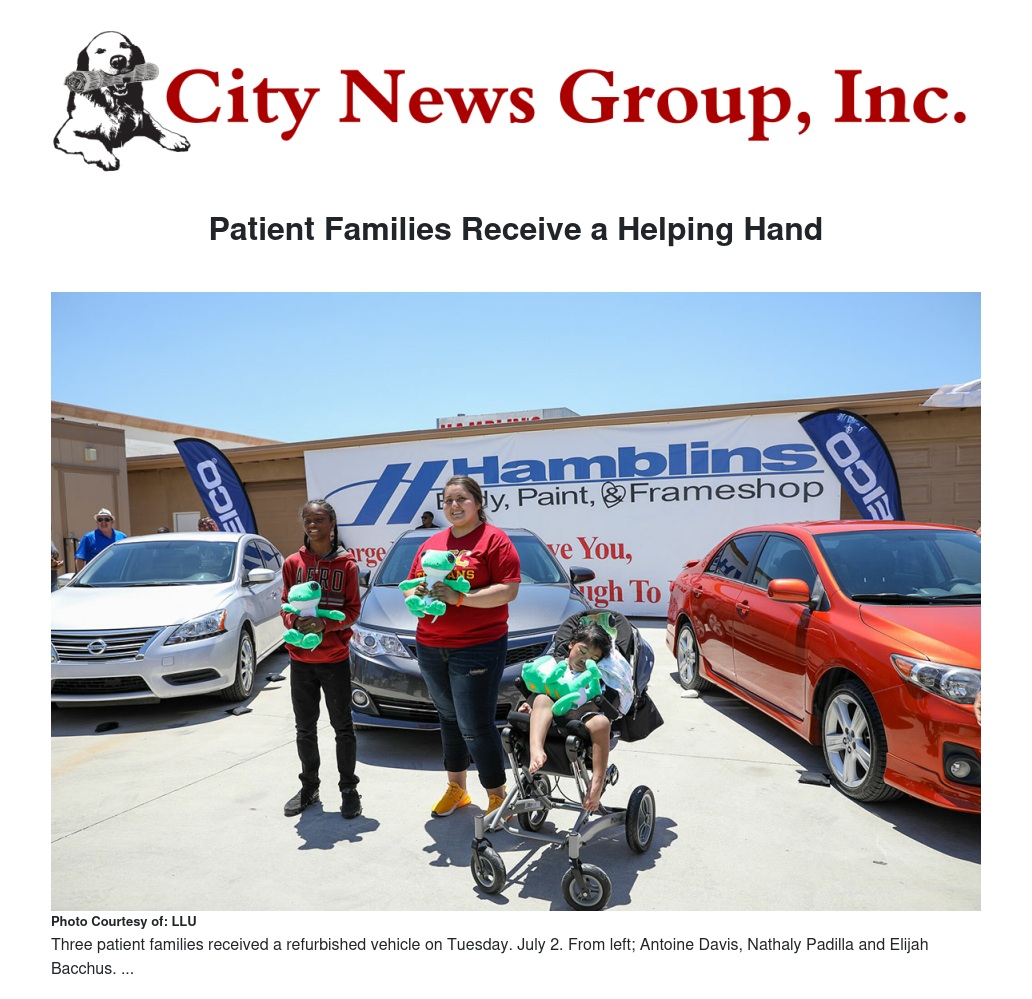 Three Loma Linda University Children’s Hospital patient families received a refurbished vehicle from the National Auto Body Council's (NABC) Recycled Rides™ program at Hamblins Body and Paint in Riverside on Tuesday, July 2.