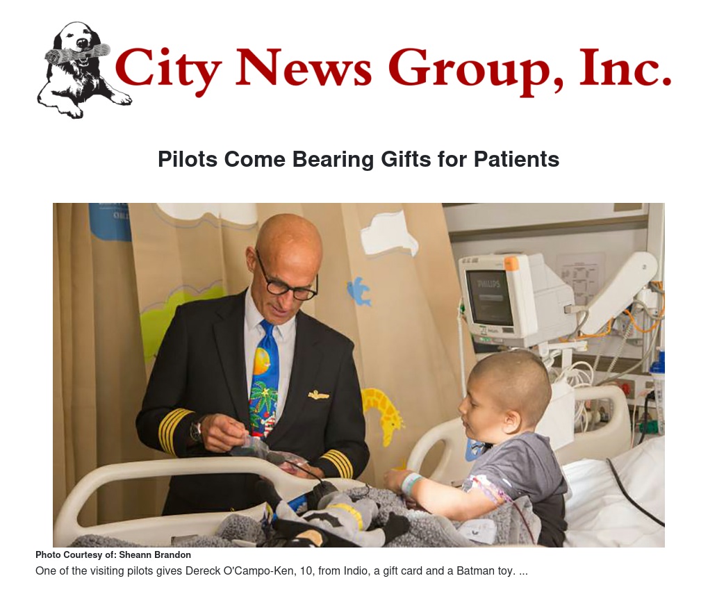 Twelve airline pilots from Pilots for Kids made a special holiday visit to patients at Loma Linda University Children’s Hospital last month — spending time chatting with each patient, answering questions about the different airplanes they flew and asking the kids questions of their own. The pilots stopped by children’s rooms in the hematology/oncology unit for several hours on Thursday, Dec. 20.