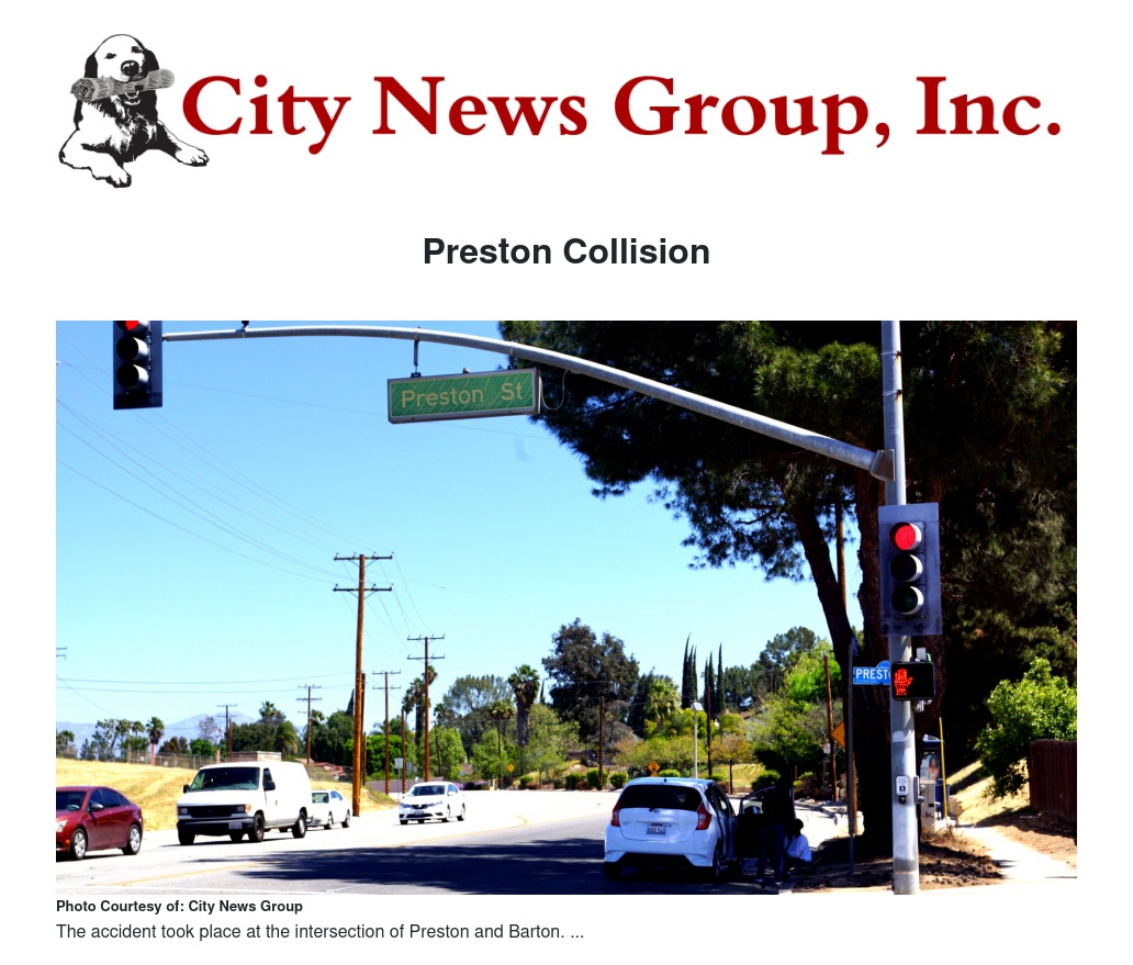 A two vehicle accident occurred today around 11:55 am at the intersection of Barton Rd. and Preston St. While both vehicles sustained damaged there was no life threatening injuries that occurred. Both drivers were able to steer their vehicles to the sides of the road to stay clear of oncoming traffic.