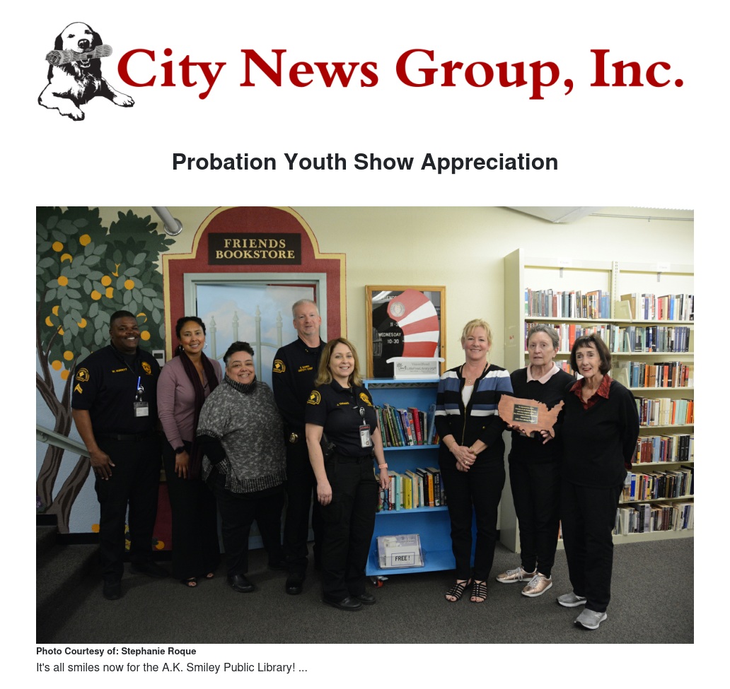 A generous book donation from the Friends of A.K. Smiley Public Library prompted youth in the San Bernardino County Probation Department’s Gateway/Regional Occupational Program (ROP) to design and create a gift of appreciation for the organization. “We, as a department, are so thankful and wanted to give something back in return,” said Probation Division Director I Kory Oberlies. “It’s important we keep these libraries stocked and we couldn’t do that without generous donations like the one from the Friends of A.K. Smiley Public Library.” On March 2, in conjunction with Read Across America, the ROP youth presented a Dr. Seuss-themed structure to the Friends Bookstore to express their gratitude following a gift of 600 books to the Probation Department’s Little Mobile Libraries Project. Through ROP, youth learn various trade skills to assist with successful community reintegration. These skills, which include wood working, landscaping, and plumbing, can be utilized at home and in the youth’s potential career field. More importantly, the youth learn how to follow directions, stay on task, complete assignments, and work together as a team. The Little Mobile Libraries Project is an award-winning program that supports reading by endorsing the “take a book, leave a book” practice. Four years ago, the Probation Department and the San Bernardino County Superintendent of Schools collaborated with the Literacy Club to build 10 Little Mobile Libraries and place them at buildings throughout the county to supply free books to readers of all ages. “We are always looking for partnerships to promote literacy in our community,” said Les King, president of Friends of A.K. Smiley Public Library. “This was a perfect opportunity for both groups.”