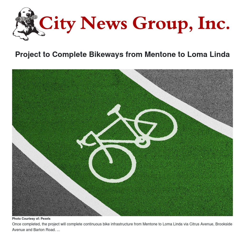 Once completed, the project will complete continuous bike infrastructure from Mentone to Loma Linda via Citrus Avenue, Brookside Avenue and Barton Road.