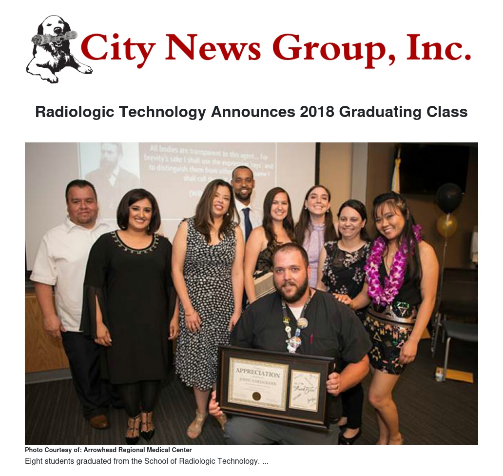 Arrowhead Regional Medical Center (ARMC) announced today the eight new radiologic technologists who have graduated from the Medical Center’s School of Radiologic Technology. The Class of 2018 joins a group of more than 320 radiologic technologists who have graduated from the program since its inception in 1975. As the only hospital-based program in Southern California, all didactic and clinical training is held at ARMC.
