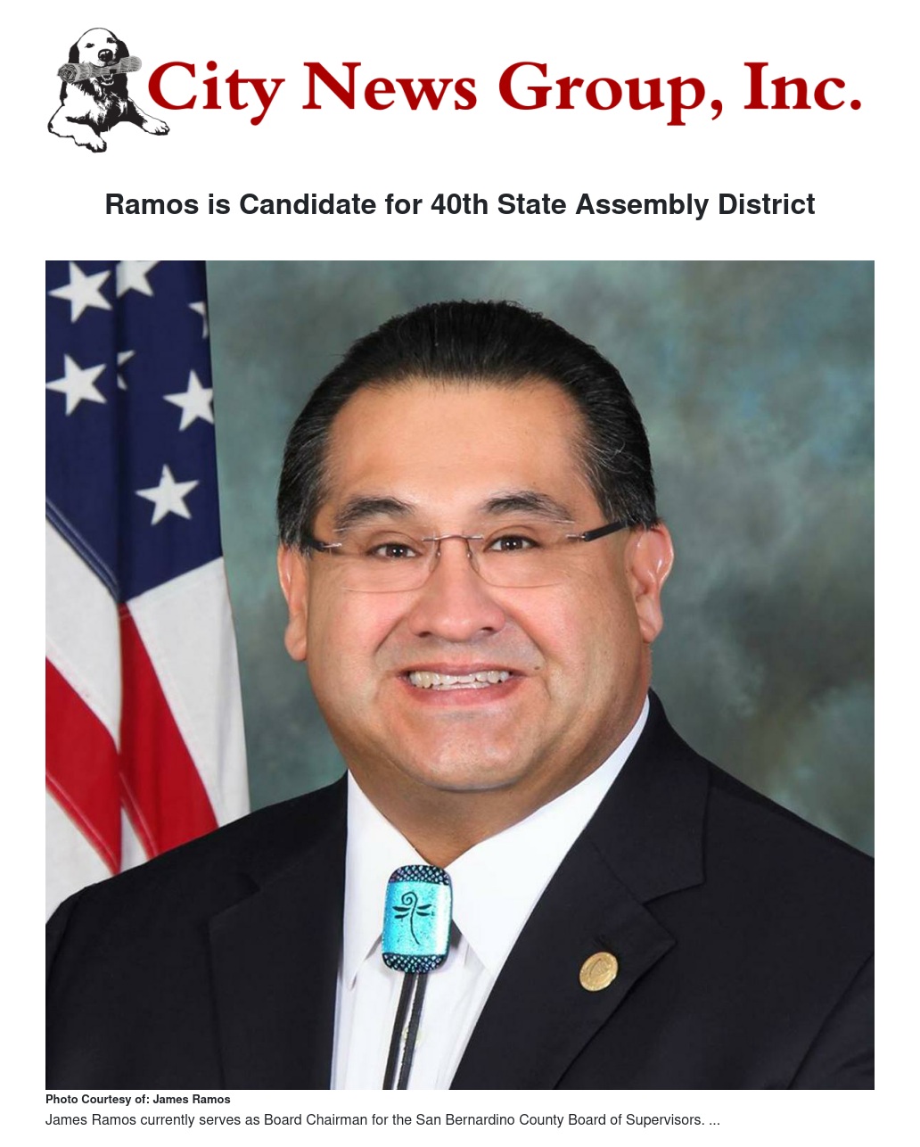 Supervisor James Ramos, a Democrat, has stated, “As a tribal leader, community leader, business owner, and a County Supervisor for the 3rd District of San Bernardino County, I have worked to make the County a better place to live and work, targeting corruption, heightened security within the different communities, bringing transparency to the County Board of Supervisors, overseeing the budget and providing a reserve for future ventures.  My focus in the future will still be with economic development growth in the Inland Empire, getting a handle on the homeless population and what services we can provide for those in need, improving the education component throughout the County and District.  Finally, provide a safe community for all families to work and play in on a daily basis.”    Ramos has formed his campaign committee and is looking forward to running for the 40th State Assembly District seat.
