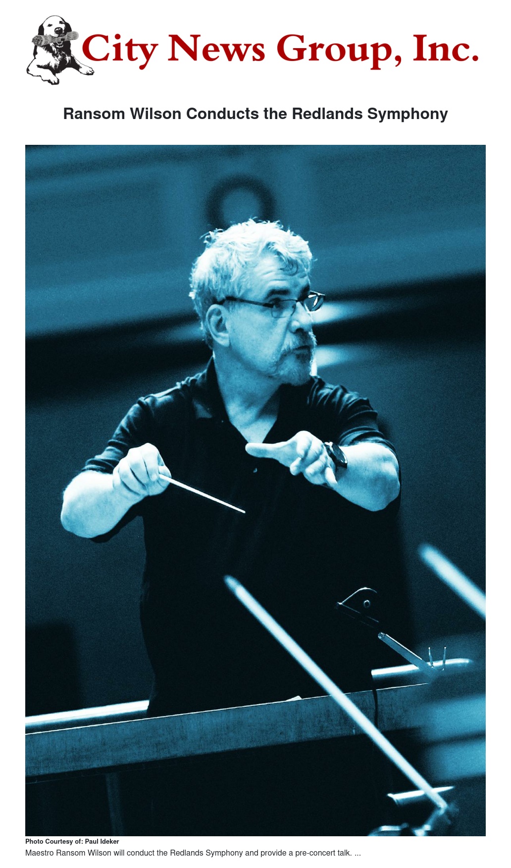 Maestro Ransom Wilson will conduct the Redlands Symphony performing a new concerto for tuba, written by award-winning composer, Lalo Schifrin on Saturday, March 3rd in Memorial Chapel on the campus of the University of Redlands. The new concerto will be performed by Gene Pokorny, principal tubist of the Chicago Symphony. Doors open at 7 PM and the concert begins at 8 PM. Maestro Wilson will present a pre-concert talk starting at 7:15 PM.