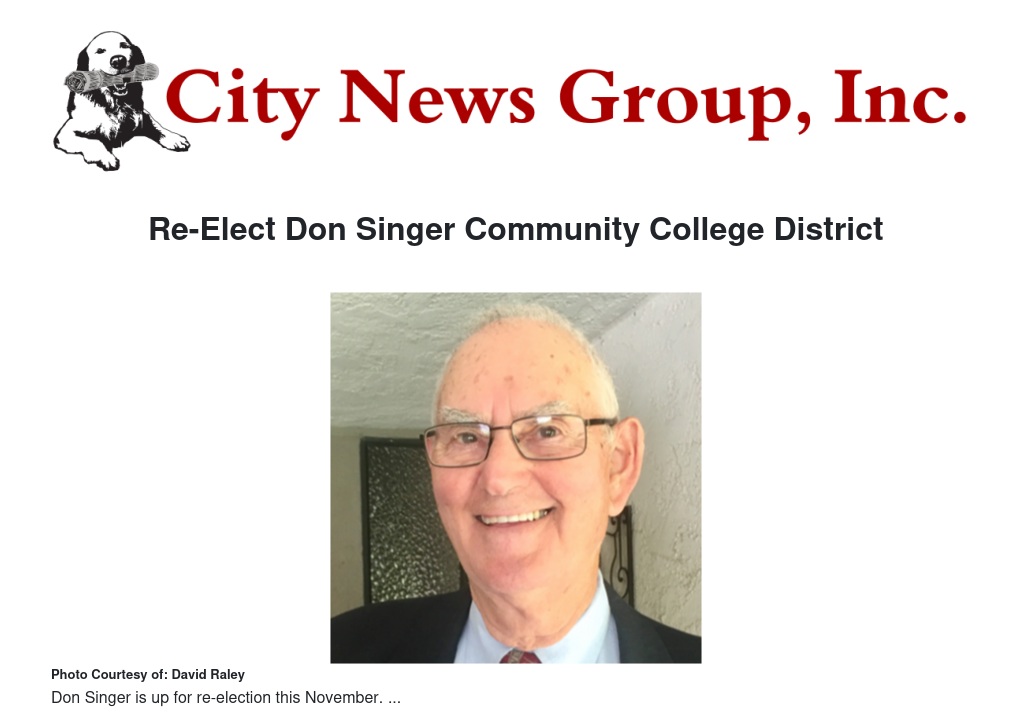 Allow me to introduce myself. I am Don Singer and I am running for re-election to the Board of Trustees of the San Bernardino Community College District. The Board is composed of seven elected officials who govern Crafton Hills College and San Bernardino Valley College and I would like to continue my service to the over 20,000 students whose lives and fortunes are improved by their going to one of two fine colleges.