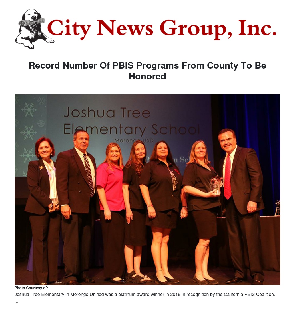 Joshua Tree Elementary in Morongo Unified was a platinum award winner in 2018 in recognition by the California PBIS Coalition.