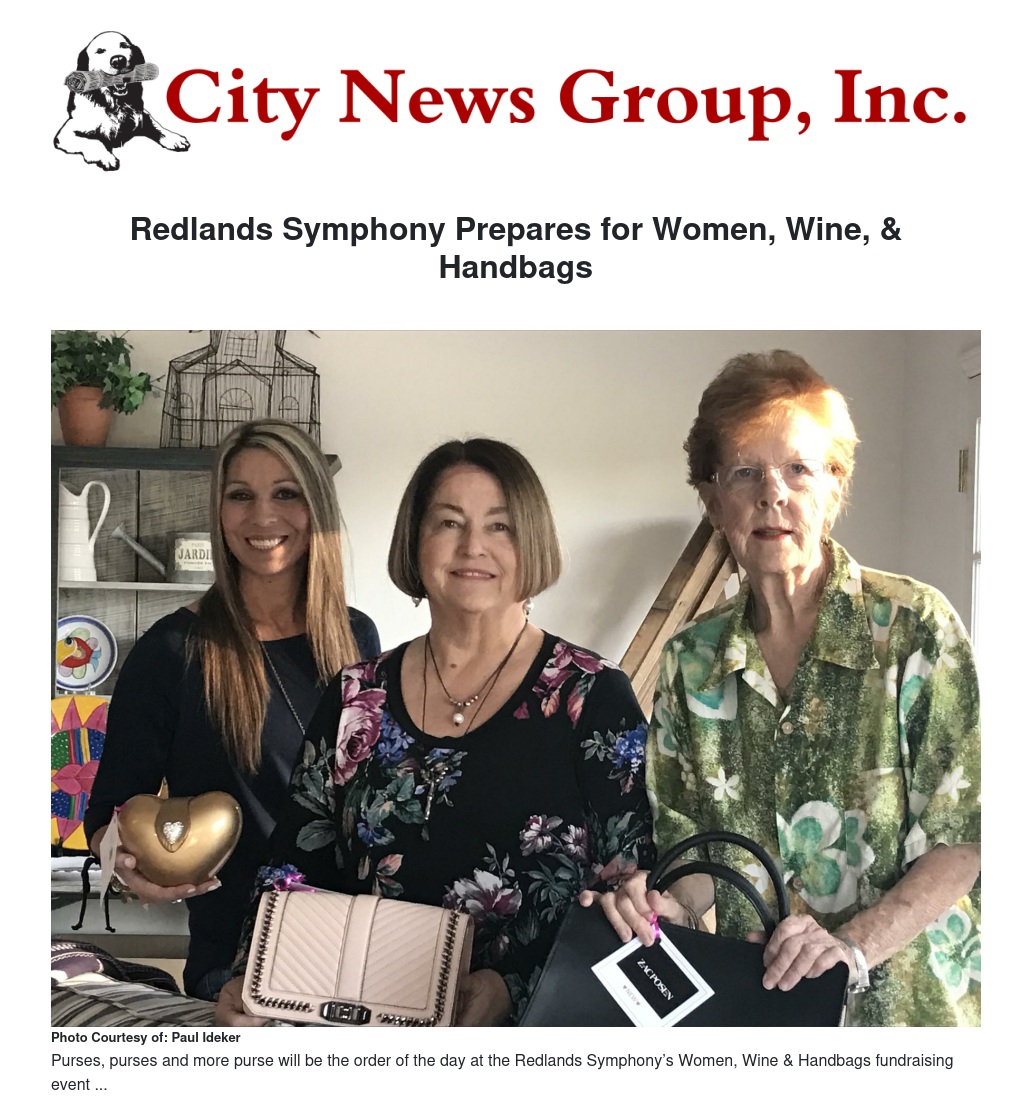 Over-the-shoulder, hobo, evening, and clutch: What do they have in common? These are just a few of the large selection of purses that will be available for sale at the Redlands Symphony Women, Wine & Handbags! fundraiser on Thursday, March 8, 2018. Tickets are $40 per person and include hors d’oeuvres and libations, as well as the right to bid on more than 100 gently used and new designer handbags.