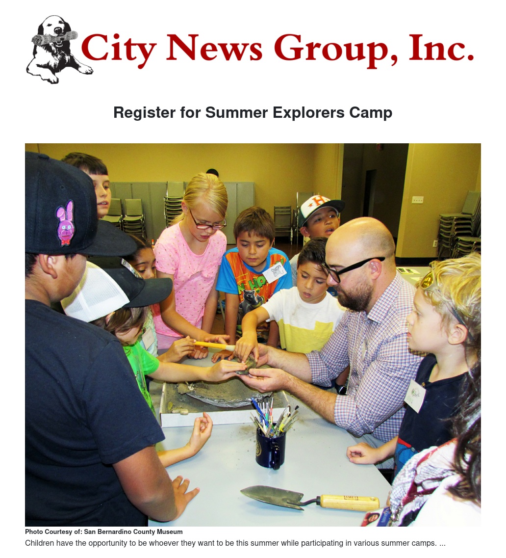 Summer Explorers and the County Museum’s other exciting events and exhibits reflect the effort by the Board of Supervisors to achieve the Countywide Vision by celebrating arts, culture, and education in the county, creating quality of life for residents and visitors. Summer Camps are supported in part by the San Bernardino County Museum Association and a generous donation from Johnnie Ann Ralph.