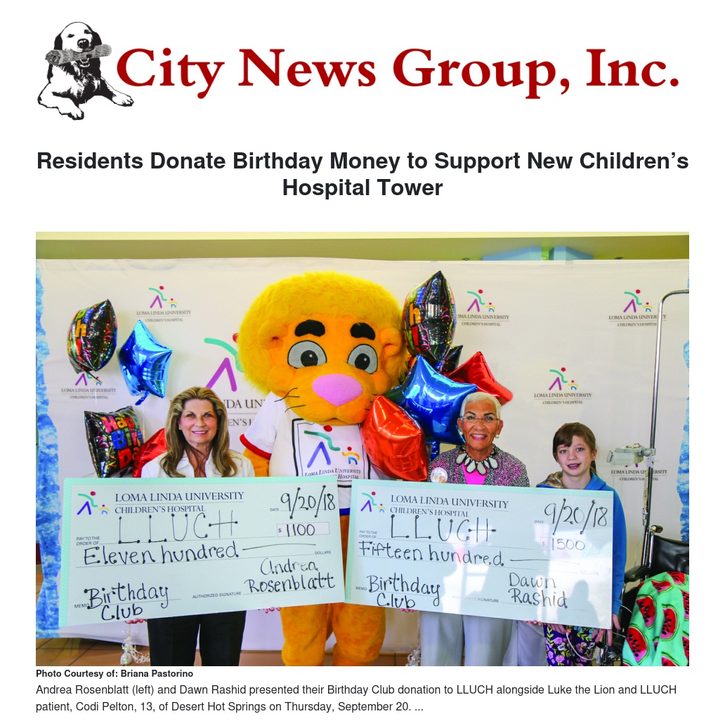 Two Coachella Valley residents recently banded together to raise funds for Loma Linda University Children’s Hospital (LLUCH). Andrea Rosenblatt and Dawn Rashid, both of Palm Desert, and board members of the Big Hearts for Little Hearts Desert Guild, collectively raised over $3,600. They presented the funds to the hospital on Thursday, September 20.