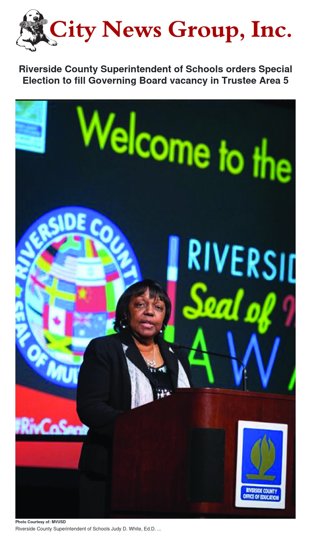 The Moreno Valley Unified School District was notified Friday, December 14, 2018 that the Riverside County Superintendent of Schools has ordered a special election, to be held on March 5, 2019, to fill the Governing Board seat in Trustee Area 5 to the end of the current term in December 2020.