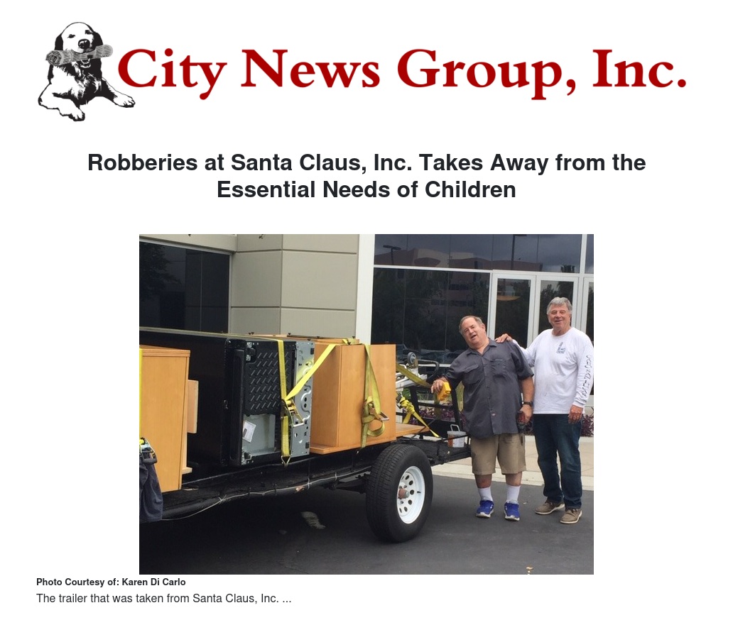 Santa Claus, Inc., at age 67, is one of the most important organizations helping over 100,000 children living in dire circumstances throughout the Inland Empire each year. It was particularly upsetting to find out that this great children’s nonprofit was robbed once again recently. Not once, but twice in the same week. The criminals took the trailer that was used almost every week to pick up all of the wonderful things from our Amazon partners throughout the Inland Empire. Then, in the second robbery they stole the toys that were being processed.