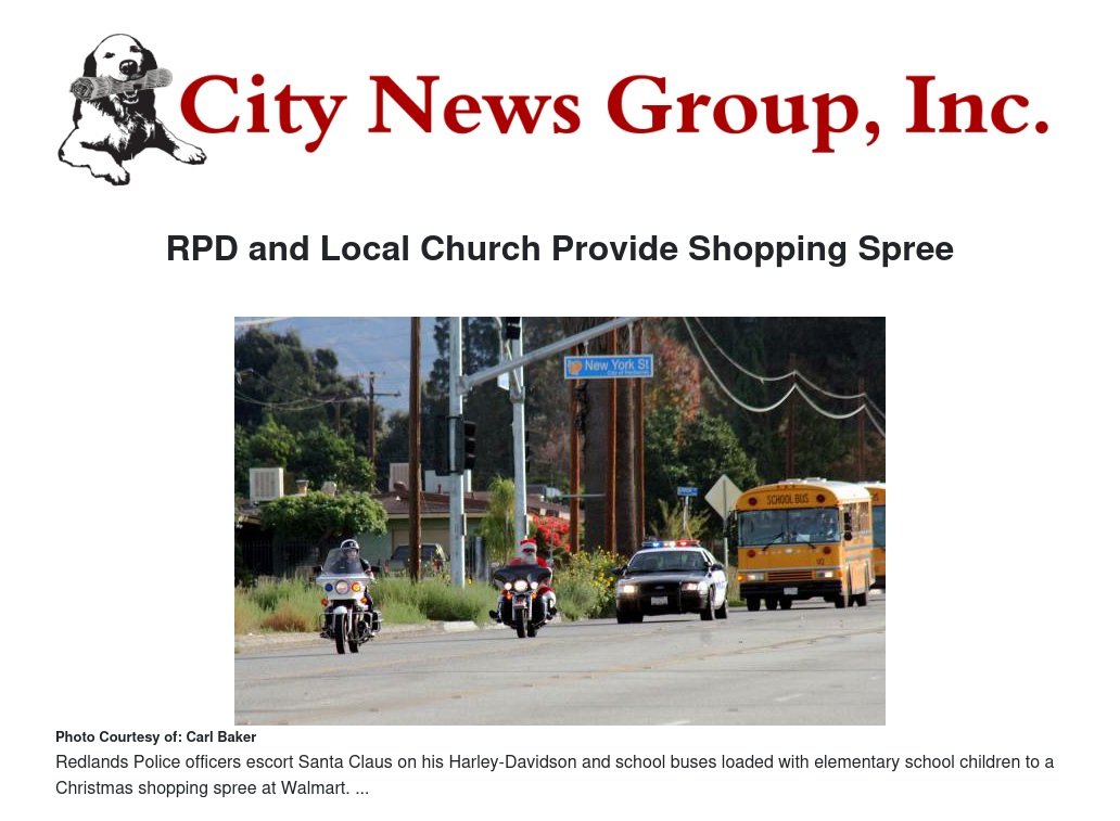 Redlands Police Department Officers will be on hand at 8:30 a.m. as members of Pathway Church take a group of underprivileged children from Lugonia and Mentone elementary schools on the $100 Christmas shopping spree at the Redlands Walmart, 2050 W. Redlands Blvd.