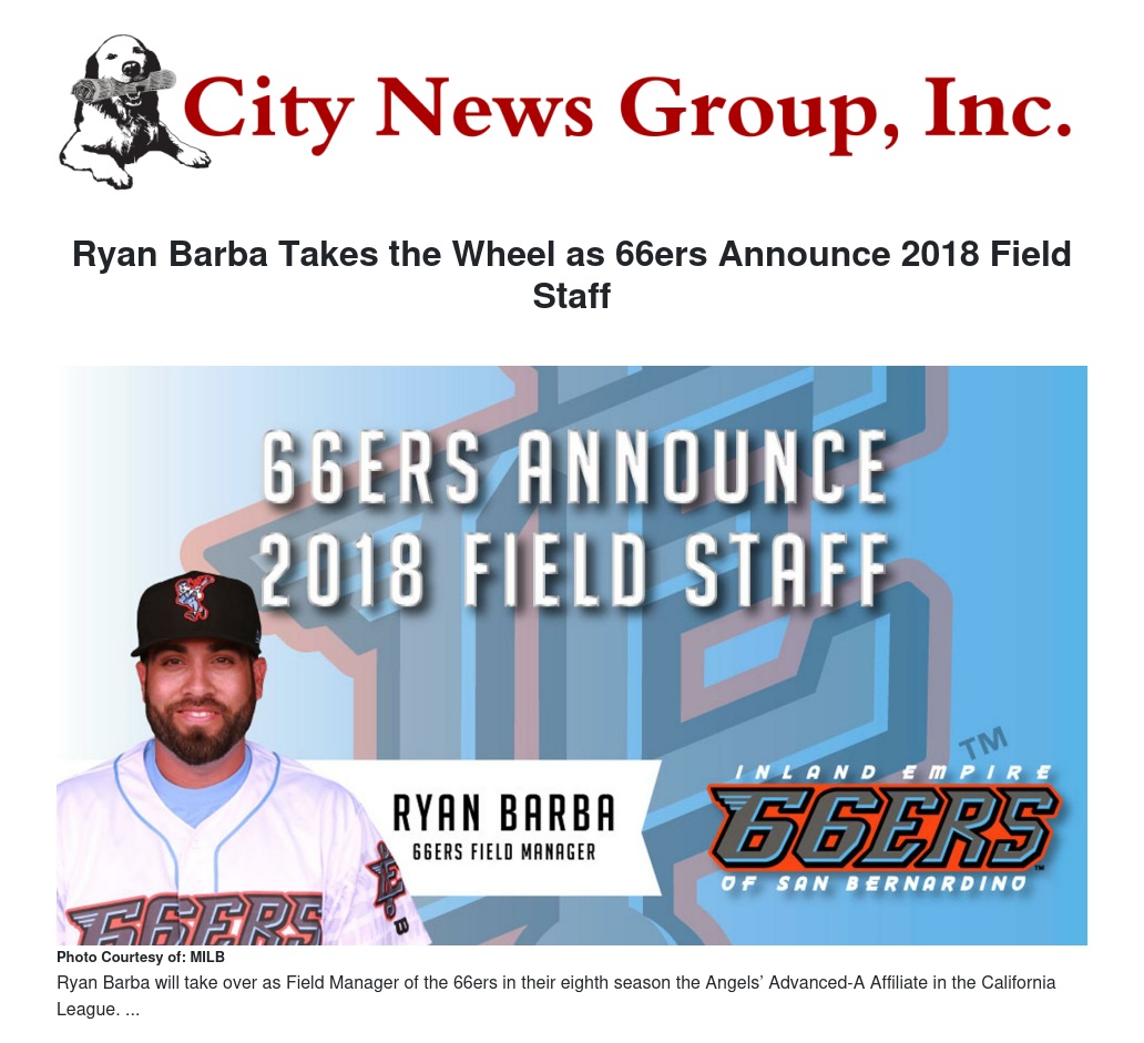 The Inland Empire 66ers of San Bernardino, in conjunction with its parent-club, the Los Angeles Angels, announced the 2018 Sixers’ Field Staff on Thursday. The 66ers will have a mix of familiar and new faces in the dugout of San Manuel Stadium on Opening Night April 5th. Ryan Barba will take over as Field Manager of the 66ers in their eighth season with the Angels’ Advanced-A Affiliate in the California League.