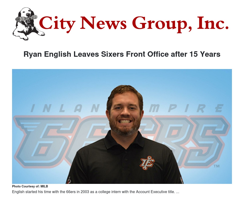 Ryan English, the Inland Empire 66ers of San Bernardino’s longest-standing front office member, says goodbye to the baseball life as he completes his final day with the organization Wednesday, January 31st. Ryan will be moving back to his hometown of Cleveland, Ohio, to start a new career in event and concert production.