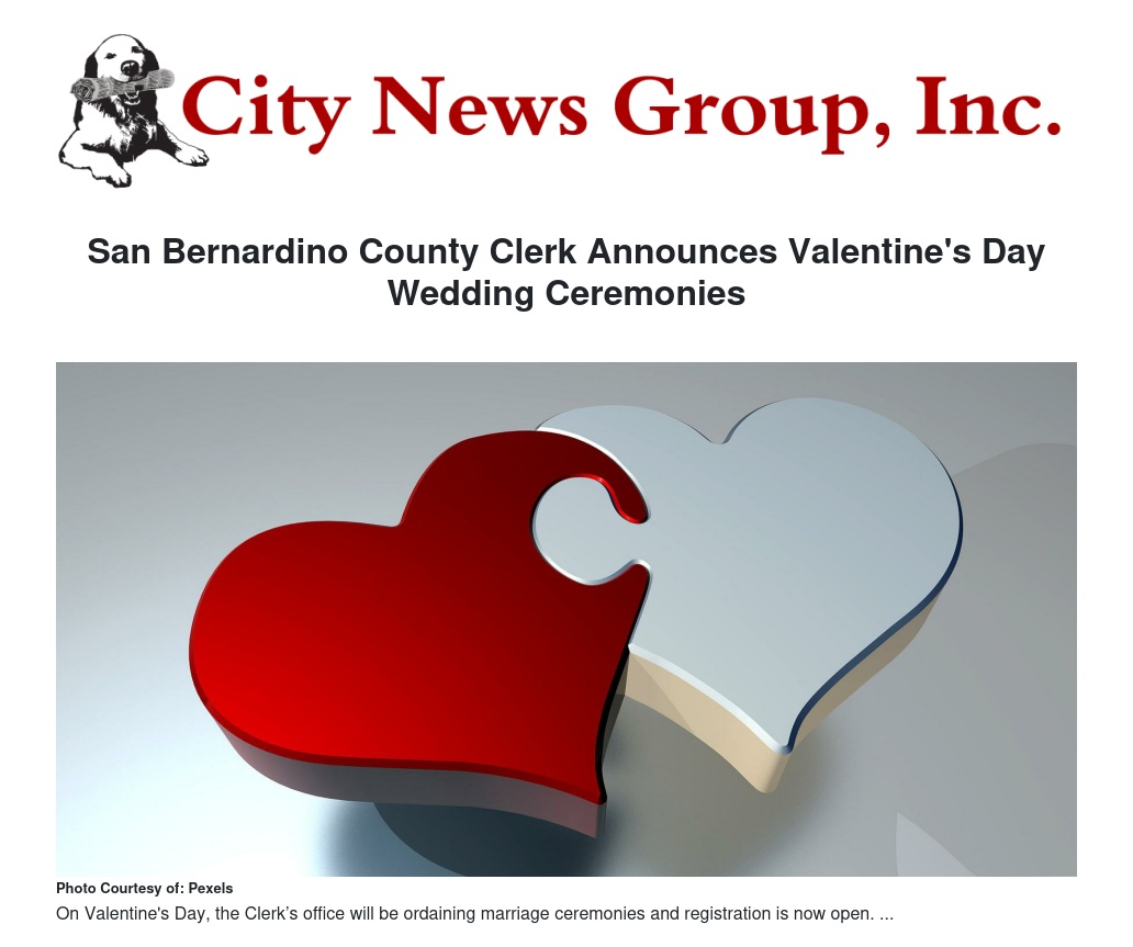 San Bernardino County Clerk Announces Valentine's Day Wedding Ceremonies