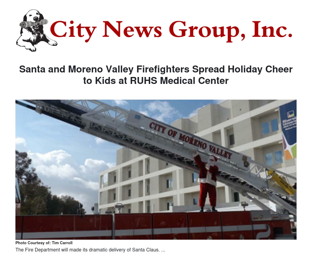 Who needs reindeer when Santa can use the City’s hook and ladder fire truck to deliver holiday cheer to the youngest patients at RUHS Medical Center?