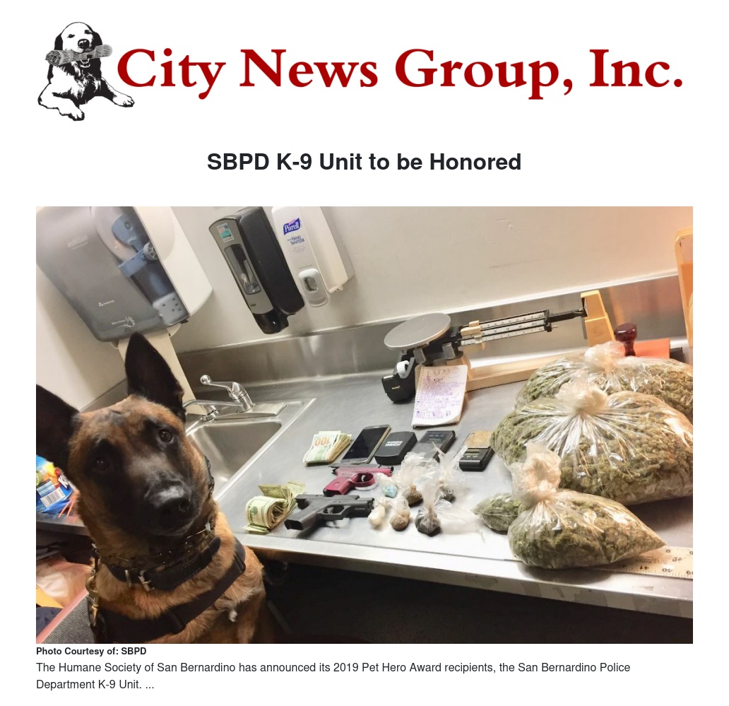 The Humane Society of San Bernardino Valley (HSSBV) is proud to announce the 2019 Pet Hero Award recipients, the San Bernardino Police Department (SBPD) K-9 Unit. The SBPD K-9 Unit will be honored at the HSSBV Walk for the Animals presented by San Manuel Band of Mission Indians at San Manuel Stadium (280 South E Street, San Bernardino) on Saturday, May 11, 2019.