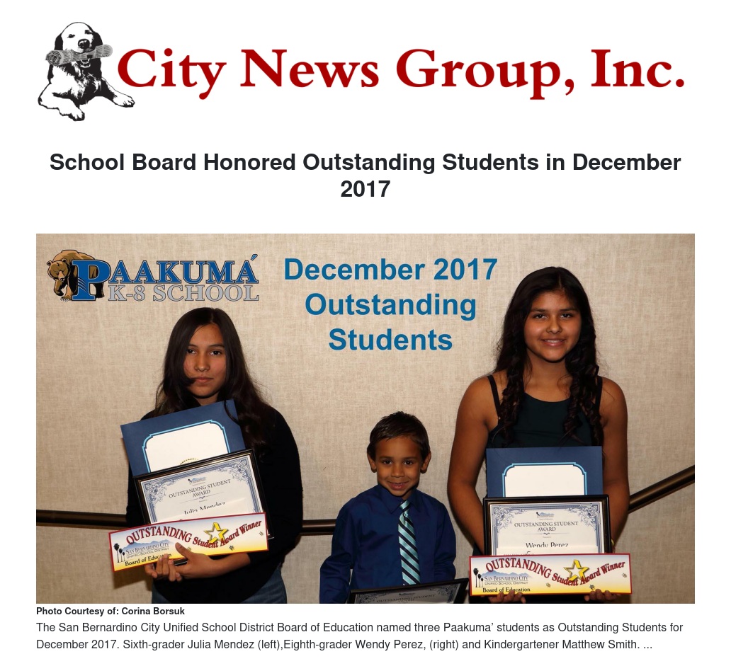 The San Bernardino City Unified School District Board of Education honored 12 students with an Outstanding Student Award at the December 5, 2017, Board meeting. The San Bernardino Symphony also recognized students by providing them and their families with free symphony tickets.
