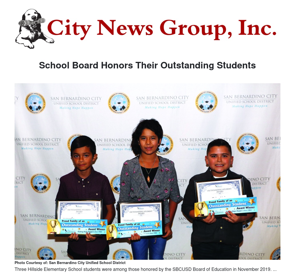 The San Bernardino City Unified School District Board of Education honored 11 students with Outstanding Student Awards. Students were also recognized by the San Bernardino Symphony, which provided them and their families with free symphony tickets, and Assembly member James Ramos, who provided each student with a certificate of recognition.