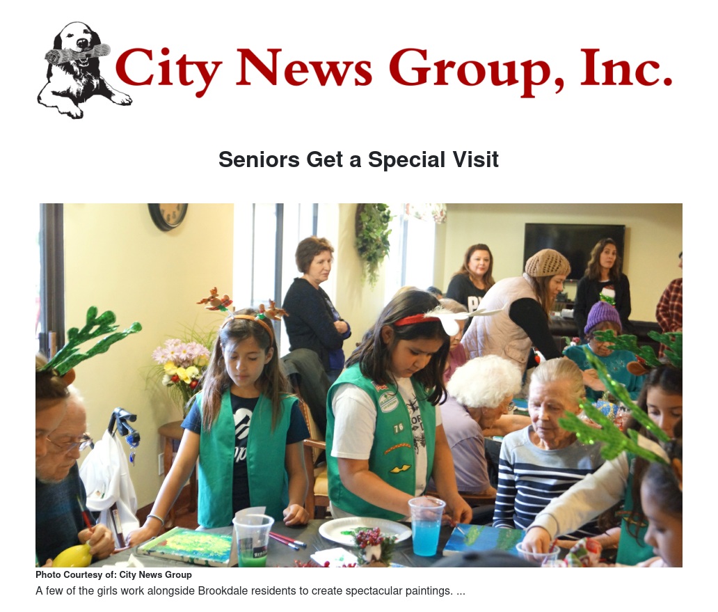 In honor of the upcoming holidays, the tenacious young ladies of Girl Scout Troop 76 elected to host a festive artwork event with the residents of Brookdale Senior Living. The activity room was appropriately adorned with its own colorful fir tree, ornaments, and wreaths, exacerbating the air of anticipation.
