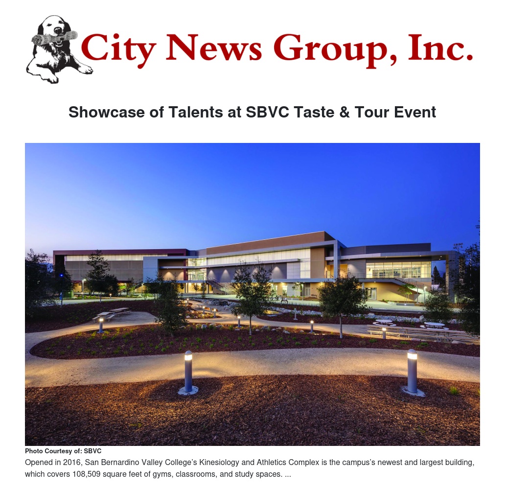 The San Bernardino Valley College (SBVC) Foundation invites guests to taste the culinary offerings of the San Bernardino community at Taste and Tour on Thursday, September 27, 2018 at 5:00 p.m. Tastings from Raising Cane’s, Arrowhead Catering, Pick Up Stix, Iron Skillet Catering, Postrecitos Cakes and Cupcakes, BJ’s Restaurant, Septembers Taproom and Eatery, Corky’s Homestyle Kitchen and Bakery, Hangar 24, and State Street Winery will be featured in addition to those provided by SBVC’s own Culinary Arts Program.