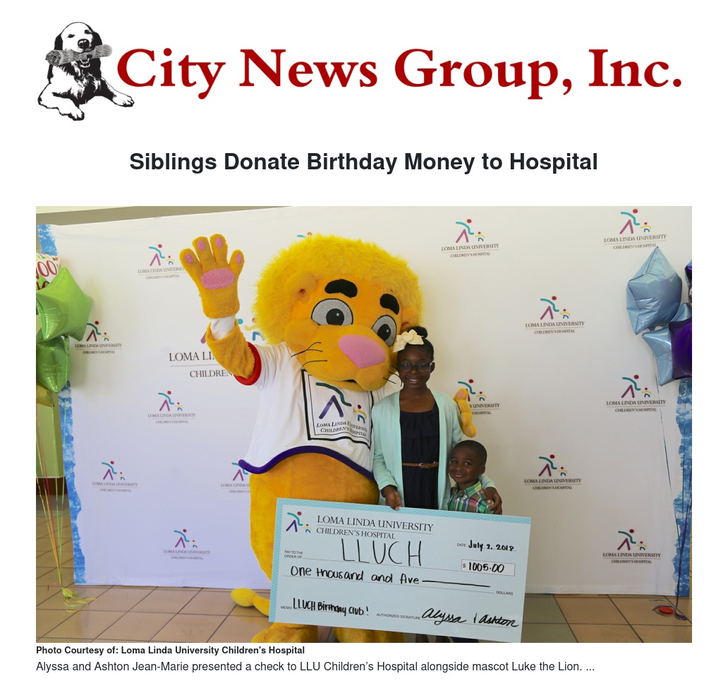 Loma Linda University Children’s Hospital (LLUCH) recently gained two young benefactors after brother-sister duo Ashton and Alyssa Jean-Marie donated over $1,000 to the LLUCH Birthday Club.