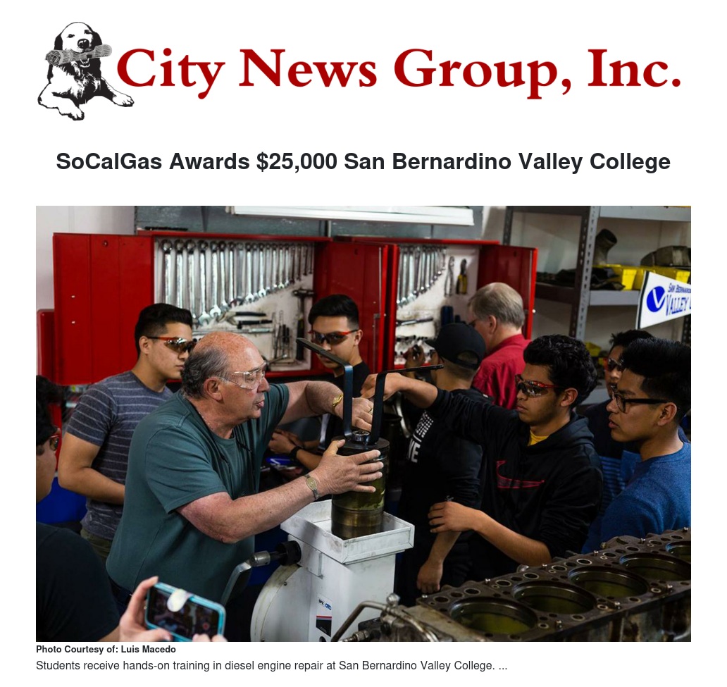 The San Bernardino Valley College Foundation has been named one of 42 non-profit recipients of the 2018 Environmental Champions Grant presented by Southern California Gas Company (SoCalGas). The $25,000 grant will support San Bernardino Valley College’s (SBVC) Automotive and Heavy/Medium Duty (Diesel) departments.