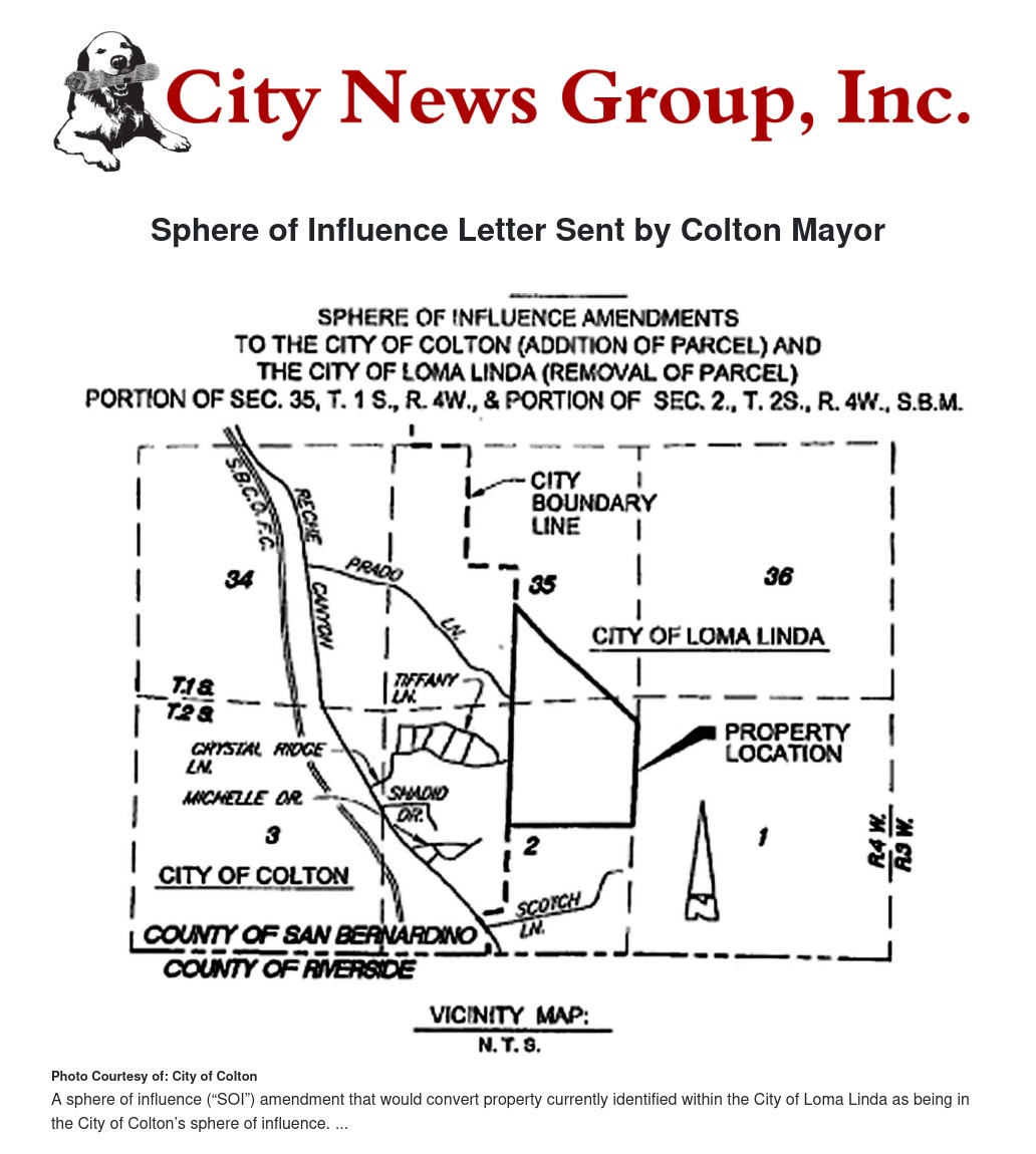 The Colton City Council was presented by city staff a letter from University Realty LLS (on behalf of the property owner) requesting that the City submit a letter of support to the San Bernardino County Local Agency Formation Commission (SB LAFCO) to authorize an application for a sphere of influence (“SOI”) amendment that would convert property currently identified within the City of Loma Linda as being in the City of Colton’s sphere of influence. In Government Code Section 56076, an SOI is “a plan for the probable physical boundaries and service area of a local government agency as determined by the commission.” The property is described as approximately 209 acres located east of the City of Colton’s easterly boundary. According to the letter, the property is currently in the City of Loma Linda but cannot be provided services from there. Instead, the requestor believes that the property is more logically served by the City of Colton. Giving the authorization of the letter of support for the SOI amendment is the first step in the process that could lead to the eventual annexation of the property into the City of Colton. As indicated in the letter, submitting a letter of support for the SOI amendment does not necessarily bind the City of Colton into supporting a future annexation or adopting any specific zoning designation or providing any particular services at this time. However though, it does indicate intent by the City to ultimately incorporate this area into its jurisdictional boundaries and to provide municipal services. There will be no California Environmental Quality Act (CEQA) action needed or fiscal impact at this time. The current owner of the property listed on the Grant Deed is Loma Linda Land 233 LLC, an Arizona limited liability company (“LLL 233”), University Realty, LLC is authorized to act on behalf of LLL 233 to process an application and related documents to add the subject property to the City of Colton’s sphere of influence, and to remove the subject property from the City of Loma Linda’s sphere of influence.