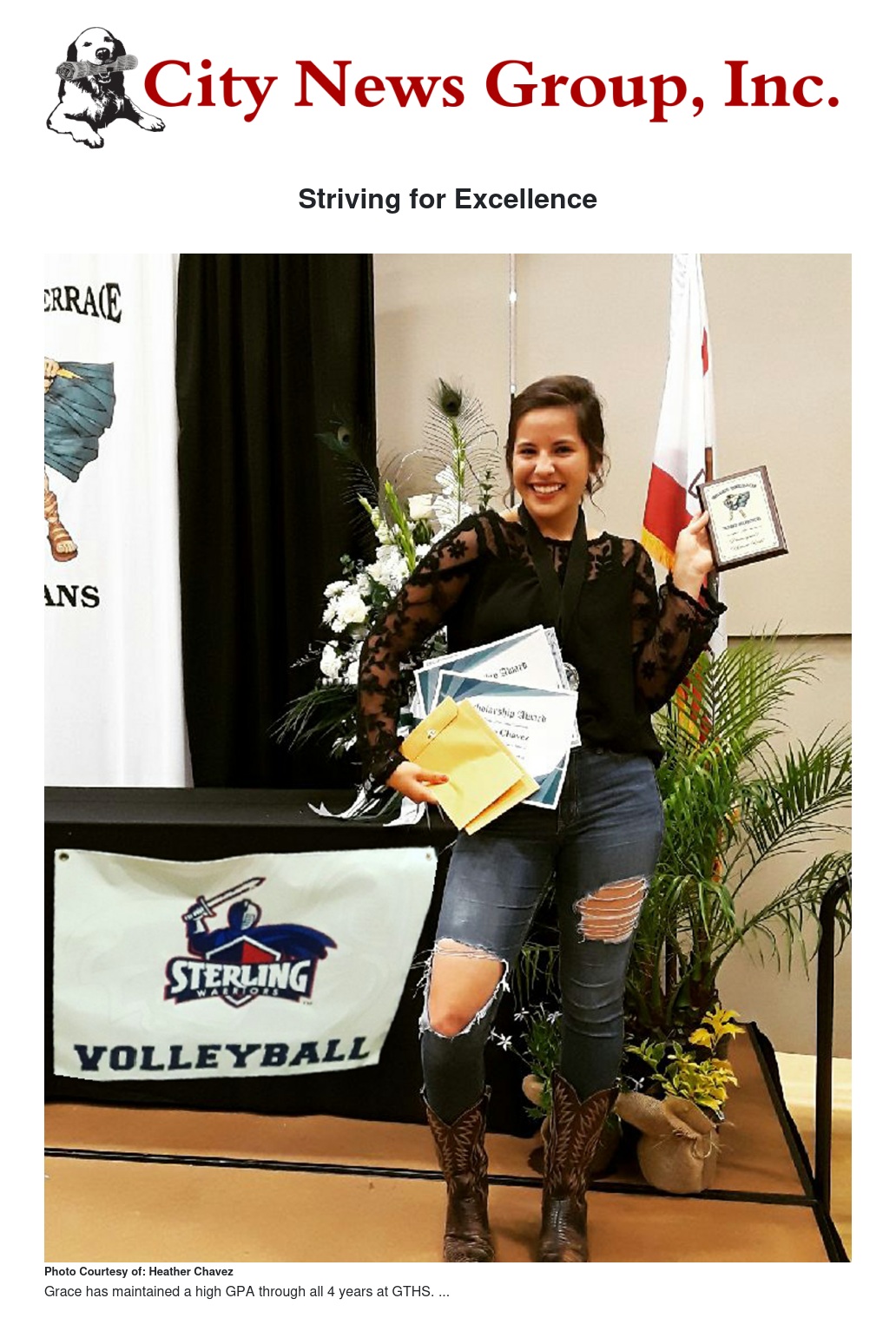 Anthony and Heather Chavez announce with great pride that their daughter, Grace Elizabeth Chavez, is graduating from Grand Terrace High School with Honors. Out of the 10 Universities she has been accepted to, Grace is accepting a scholastic and volleyball scholarship at Sterling College in Kansas.
