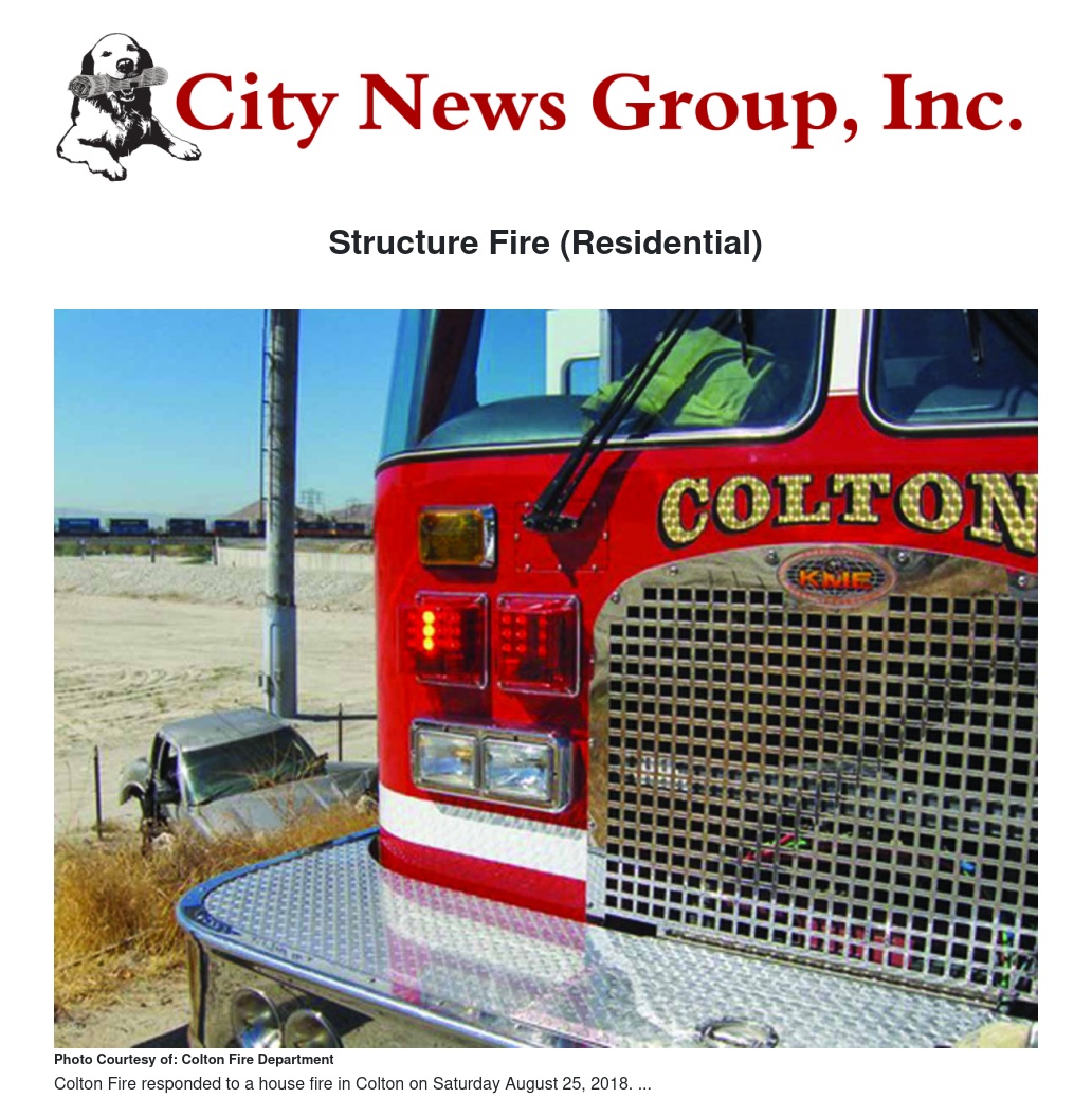 On Saturday August 25, 2018 at 7:49 PM Colton Police along with Colton Fire responded to the 1200 block of Center Drive in reference to a structure fire (residential). Upon initial investigation of the fire one victim was located outside of the residence and transported to a local hospital for injuries. A second victim was located deceased inside the residence. Colton Police Department Detectives along with Colton Fire Arson Investigators and San Bernardino County Sherriff’s Department Bomb and Arson Division were notified and responded to the scene. Investigation is ongoing.