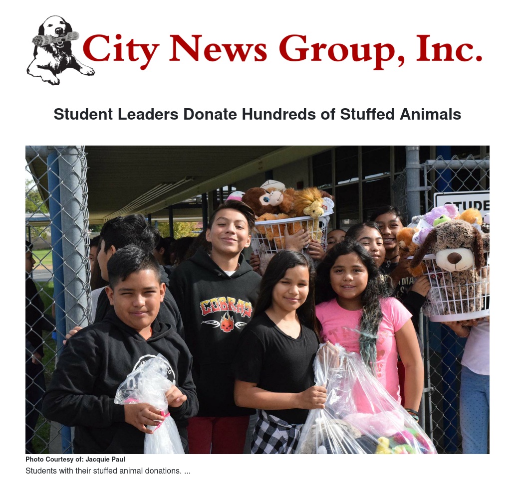 Student leaders at Ruth Grimes Elementary School have spent months spearheading a donation drive to collect stuffed animals for children and seniors in need and are giving more than 200 of the toys to the Rialto Police Department, the non-profit organization Childhelp and a senior housing complex.