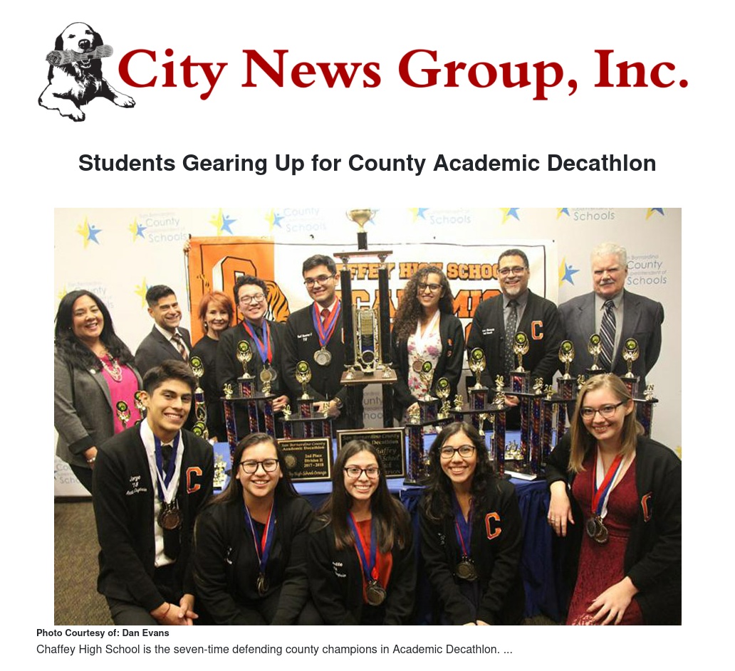 This year's participating high schools and their districts are: Alta Loma High, Chaffey High, Colony High, Etiwanda High, Los Osos High, Montclair High, Ontario High and Rancho Cucamonga High, Chaffey Joint Union High; Chino Hills High and Don Lugo High, Chino Valley Unified; Kaiser High and Summit High, Fontana Unified; Citrus Valley High, Redlands East Valley High and Redlands High, Redlands Unified; Eisenhower High and Rialto High, Rialto Unified; Arroyo Valley High, San Bernardino High and San Gorgonio High, San Bernardino City Unified; and Cobalt Institute of Math and Science, Lakeview Leadership Academy and Victor Valley High, Victor Valley Union High. Aquinas High School, a private school, also is participating.