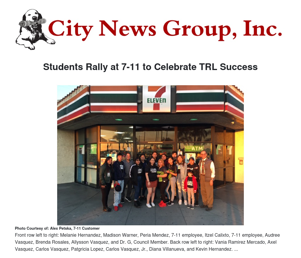 To celebrate their success for the TRL adoption and the “City on the Rise” recognition, members of the Coalition for Change, Mental Health Systems, Santinder Cheema, owner of 7-11, and Dr. G, Council Member, teamed up for an informal rally at the local 7-11 business at 202 N Mt. Vernon Ave., which is one of the principal supporters of the new TRL program requirement.