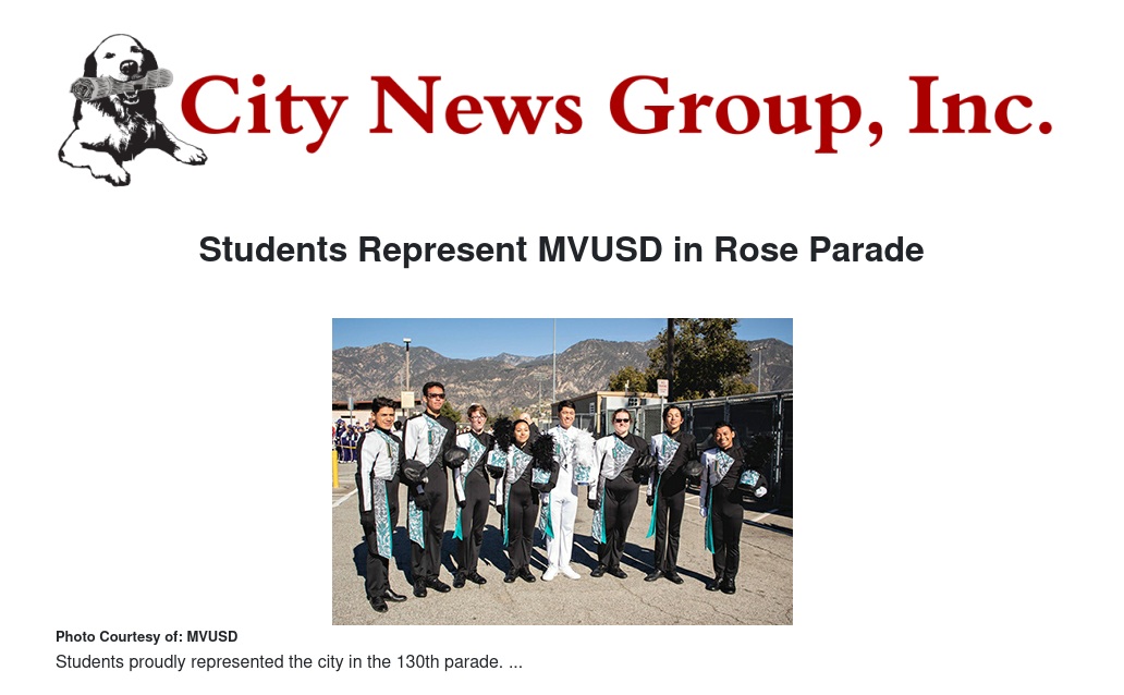 Students and alumni from Moreno Valley Unified School District represented the district on January 1 by participating with Pacific Crest Drum and Bugle Corps during the 130th Rose Parade in Pasadena.