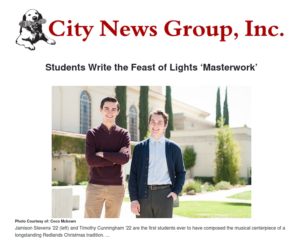 Since the annual University of Redlands Feast of Lights was conceived in 1947, this musical portrait of the birth of Christ has been renowned for its artistry— the music, the costumes, the tableaux, the candlelight — as well as for its hopeful, joyous spirit. This year’s performance is even more exceptional, as the composers of the show’s musical centerpiece are U of R music composition majors Jamison Stevens ’22 and Timothy Cunningham ’22.