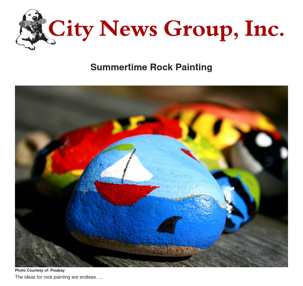 Supplies: You will need acrylic paints, smaller bottles are best so you can afford a variety of colors, paper plates for paint palettes, white glue, economical paint brushes and old City News Newspapers to cover the painting surface. If you really want to add some fun throw in a package of googly eyes or rhinestones. If the rocks are going to live in the garden or flower beds, you may want to spray them with a clear paint for longer wear.