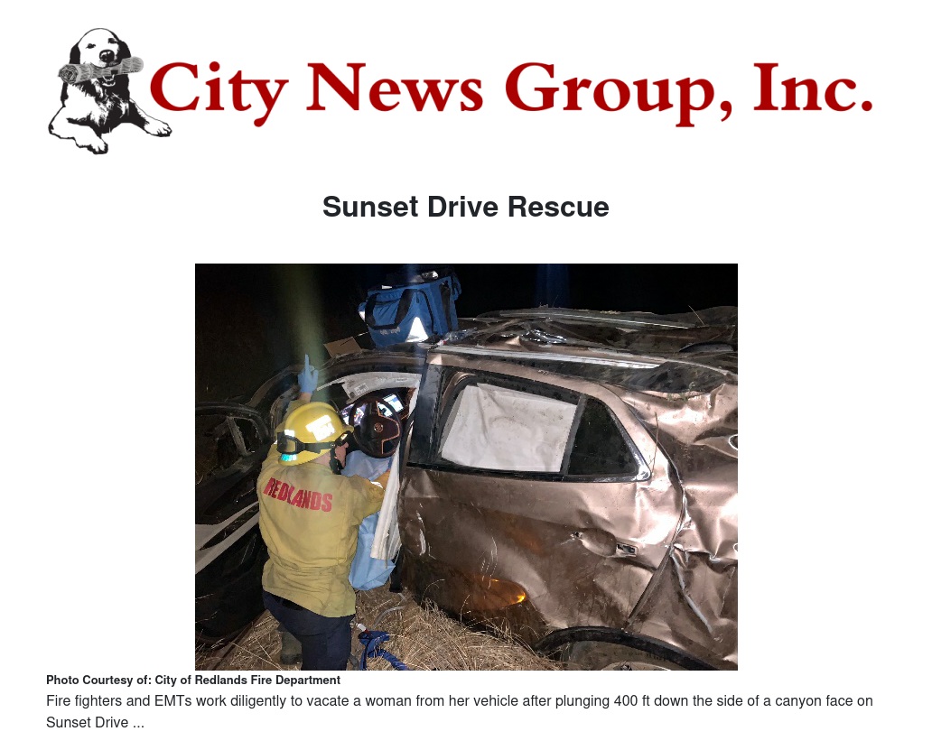 The Redlands Fire Department and Redlands Police responded shortly before 7 p.m. to a call of a vehicle over the side on Sunset Drive near Crown Street. Fire Department crews accessed the vehicle from Sunset Drive while others made access from the bottom of the canyon off of Alessandro Road.