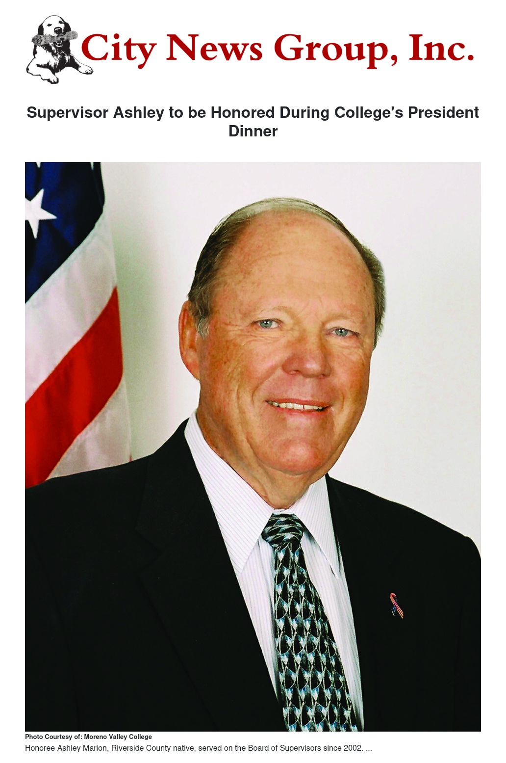 Retiring Riverside County Supervisor Marion Ashley will be presented with Moreno Valley College’s President’s Award at the College’s President’s Dinner.