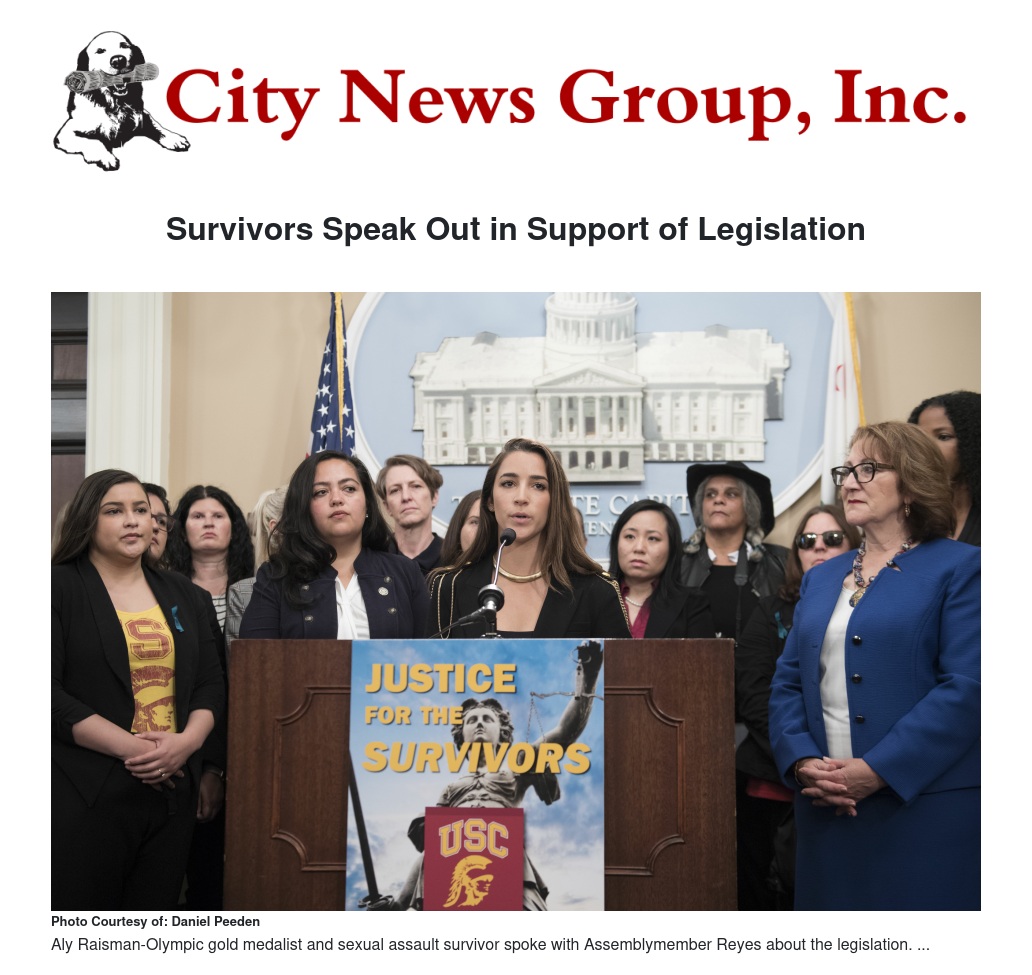 It is estimated that over 14,000 female students were impacted by Tyndall since the start of his tenure in 1989. More than 30 women joined Assemblymember Reyes in solidarity, including speakers such as Nicole Haynes, a Tyndall survivor and broadcast journalist, and Aly Raisman, a three-time Olympic gold medalist and survivor of former USA Gymnastics team doctor Larry Nassar.