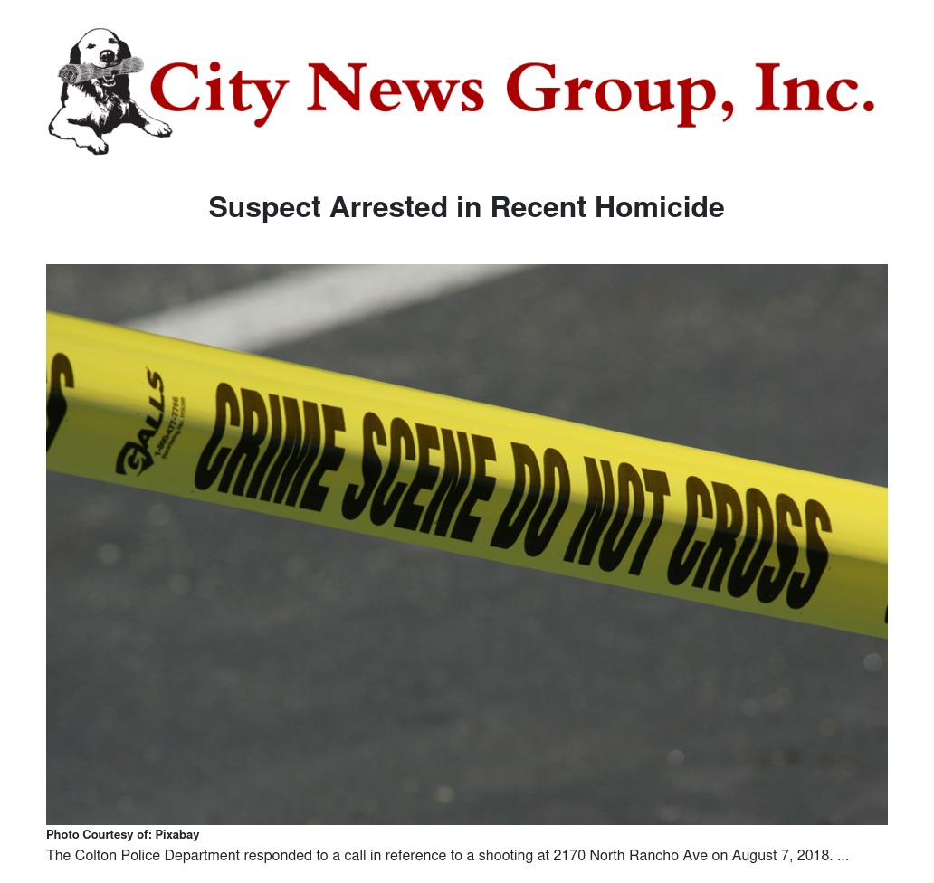 On 8/7/18 at approximately 3:42 P.M. the Colton Police Department received call in reference to a shooting and a possible victim inside of a vehicle. When officers arrived at the location they discovered an adult male, mid-twenties suffering from multiple gunshot wounds to his upper body. Colton Fire Department arrived on scene and pronounced the victim deceased. Weapon used is believed to be a handgun. The name of the victim is being withheld pending notification of next of kin. The investigation is being conducted by the Colton Police Detective Division with assistance from the San Bernardino Sheriff's Crime Scene Investigations.